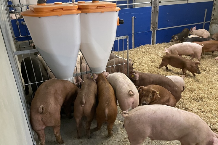 In unserem neuen Systemstall geht so einiges vollautomatisch. Wie zum Beispiel den Stroh-Nachschub. Mehrmals täglich kommen unsere Durocs in den Genuss einer ausgiebigen Strohdusche. Von unseren eigenen Feldern geerntetes Stroh rieselt auf die Tiere herab und bedeckt danach den Boden als luftige Strohmatratze. Das lädt erst zum energischen Wühlen ein und danach zu einem erholsamen Nickerchen. Wir sind jeden Tag aufs Neue fasziniert davon, wie sich unsere Schweine in ihrem Stroh sauwohl fühlen.